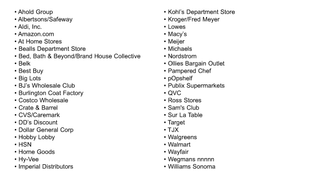 Una muestra de los principales minoristas estadounidenses registrados, de categorías como tiendas de consumo masivo, artículos para el hogar, tiendas departamentales, supermercados, tiendas de conveniencia, ferretería, artesanías y hobbies, y tiendas de descuento, incluye: